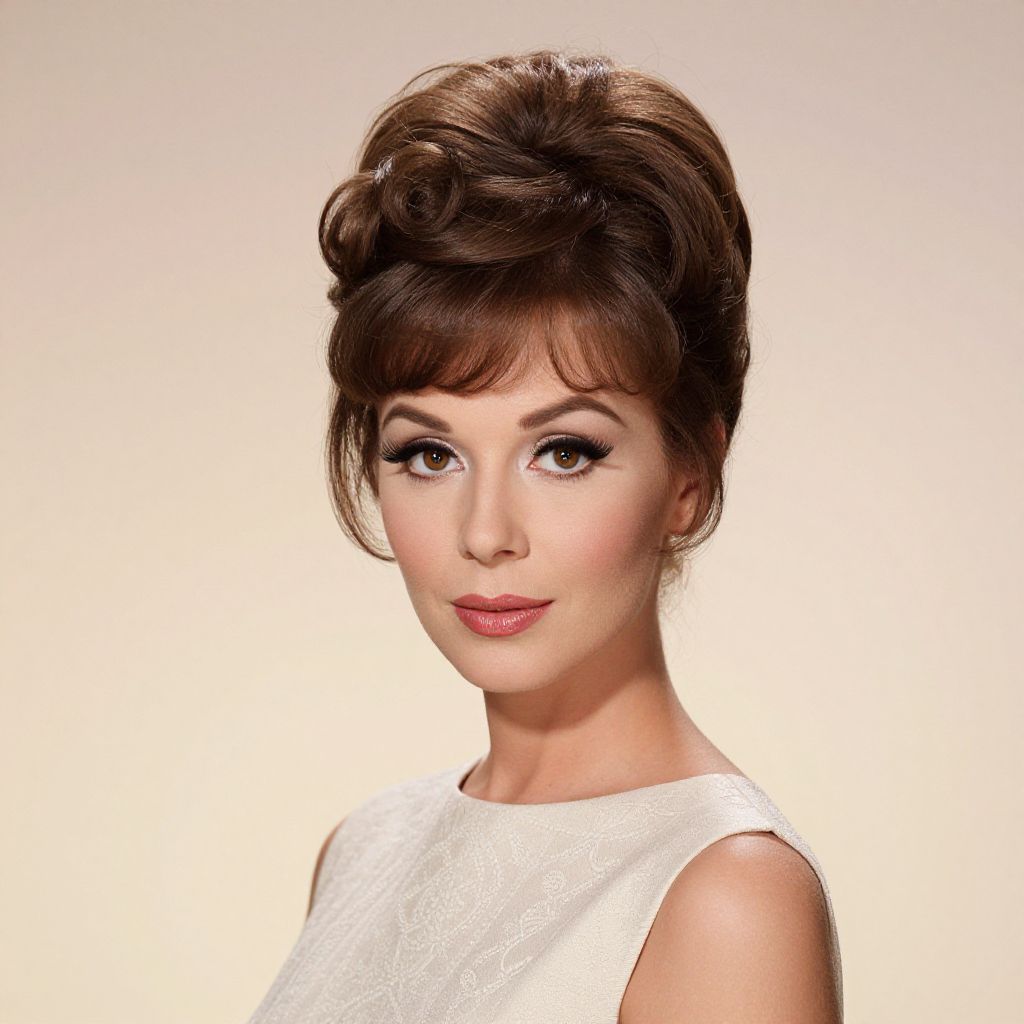 Portrait of a 1960s woman showcasing 60's bouffant beehive hair, subtle pastel gradient background, soft glowing effect, classic eyeliner and lipstick makeup, elegant vintage dress, 4k realistic style, studio lighting