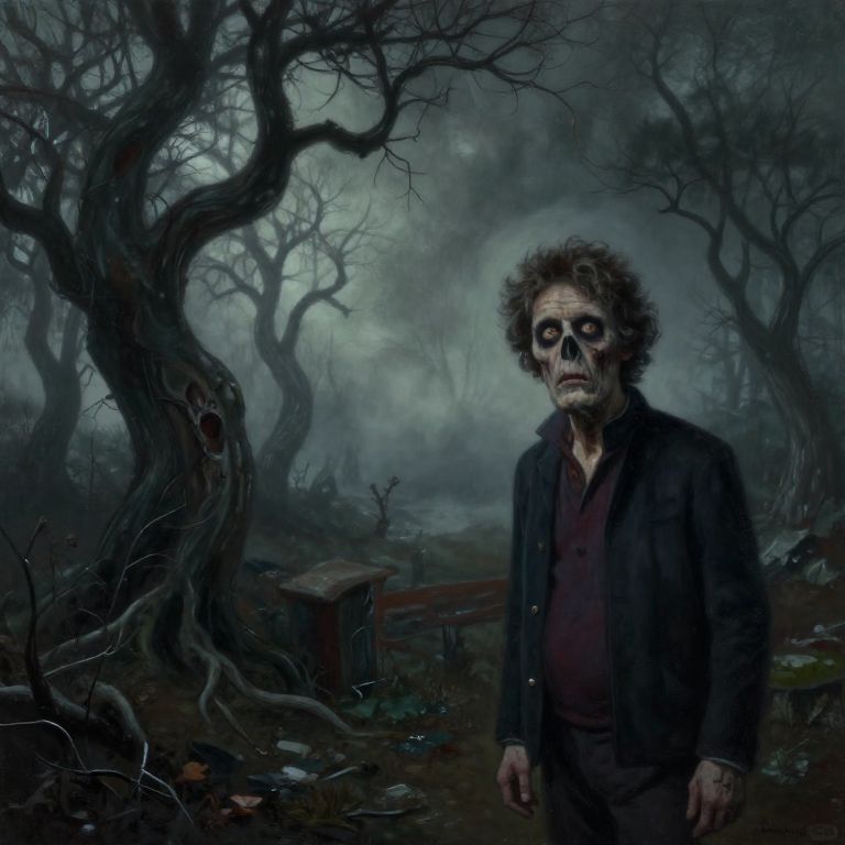 Ugly old person depicted in a surreal style, distorted facial features blending with cracked stone textures, set against a twilight sky with eerie fog and twisted trees