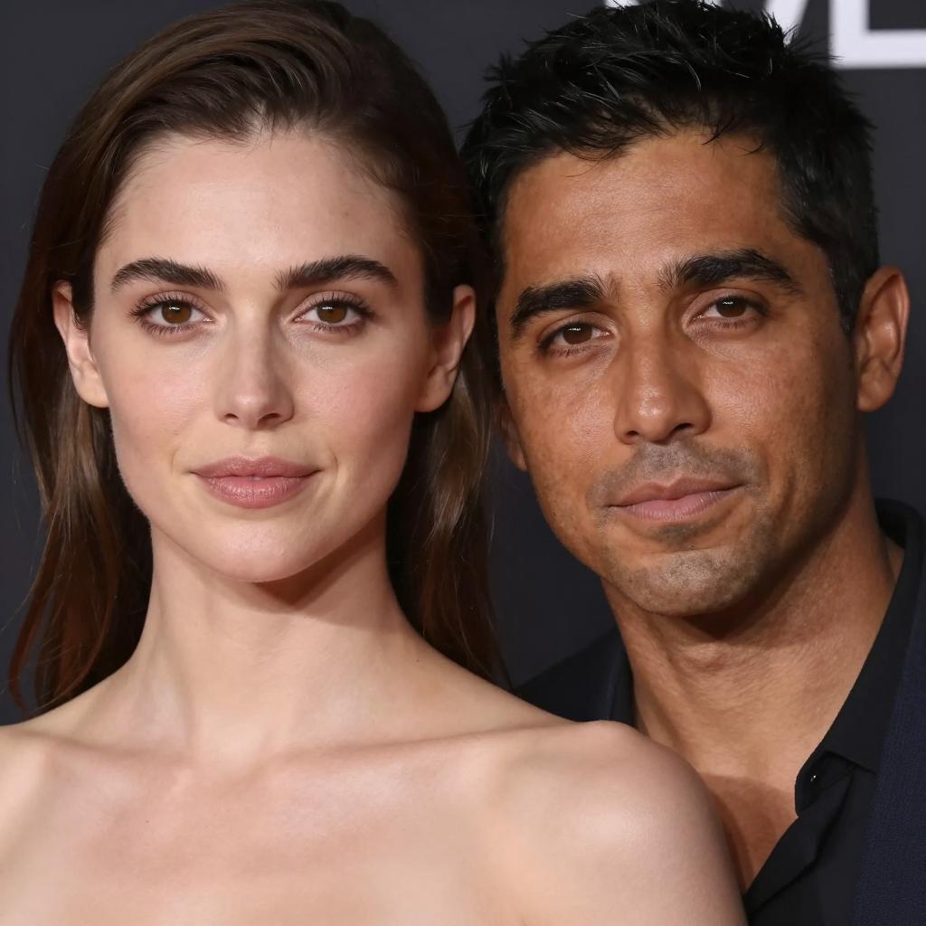 Photograph of a smiling blonde man with short hair and a fair complexion, standing close behind a smiling brunette woman with blue eyes and fair skin. Both wear black tops, against a blurred white and blue background.