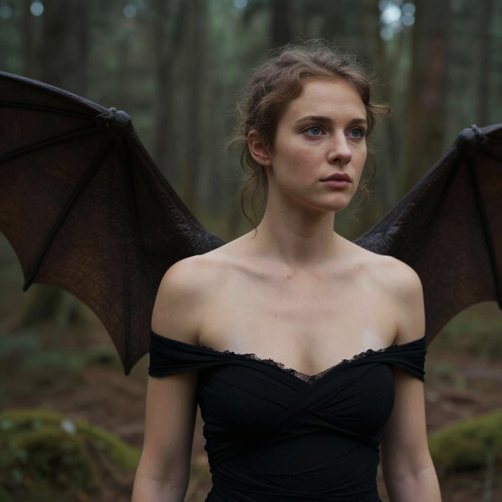 Winged Woman in Black Dress Forest
