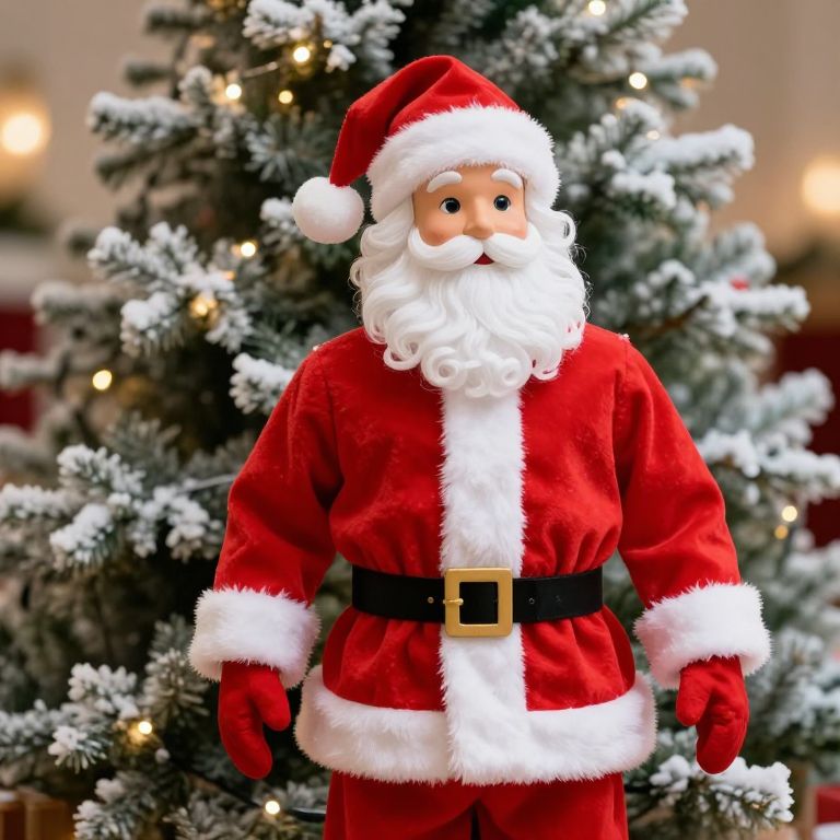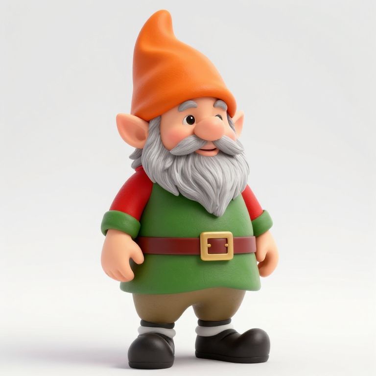 A doll with a green sweater and a red hat is standing on a street. The doll has a long white beard and is wearing a brown belt with a gold buckle.