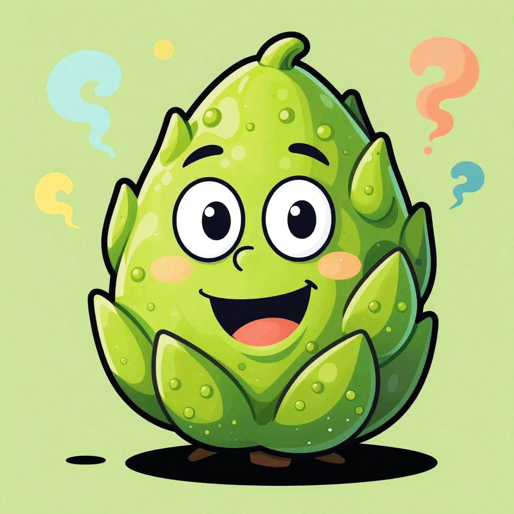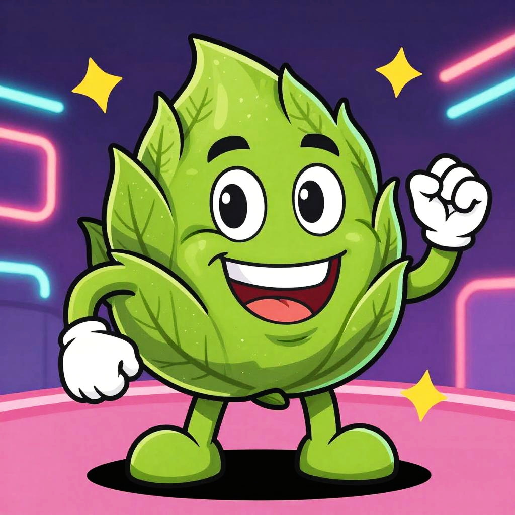 Vibrant digital illustration of a cheerful, green leaf-shaped cartoon character with large eyes, white gloves, and raised fist, set against a neon-l