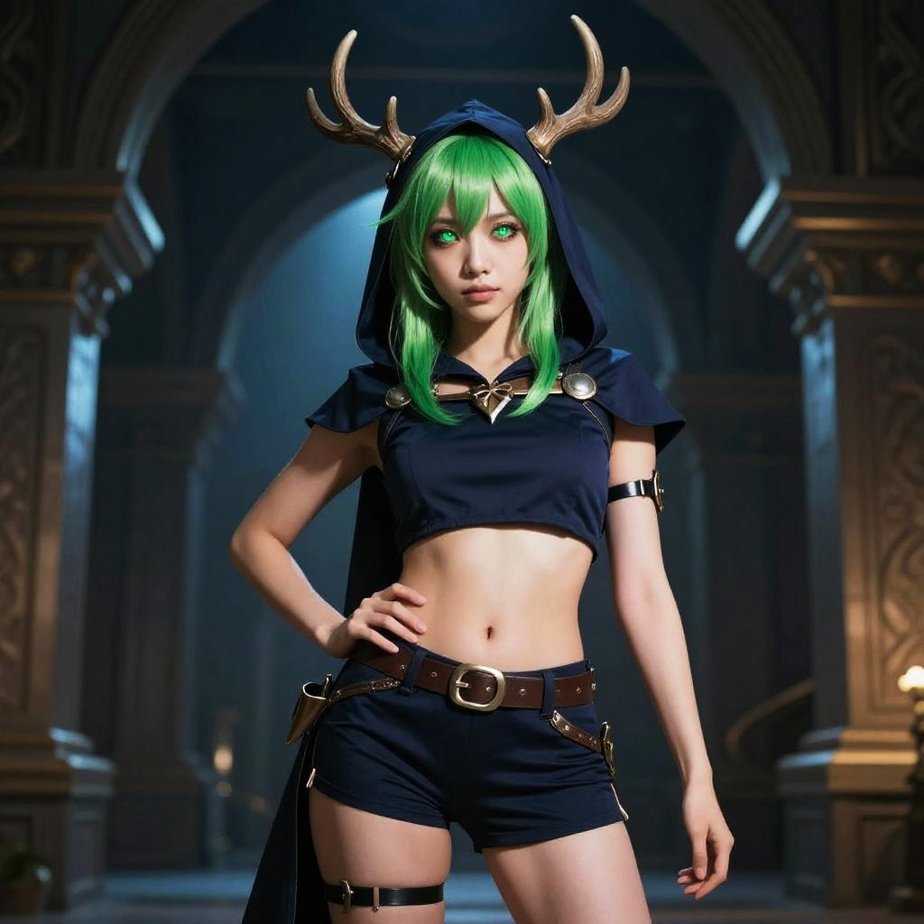 A green-haired fantasy character with glowing eyes wearing a dark hooded crop top and shorts with antler headgear, posing confidently in a dramatic architectural setting with strong moody lighting and intricate shadows, vivid and vibrant color scheme emphasizing deep blues, greens, and subtle warm skin tones, highly detailed shading and smooth skin texture, fantasy fashion style