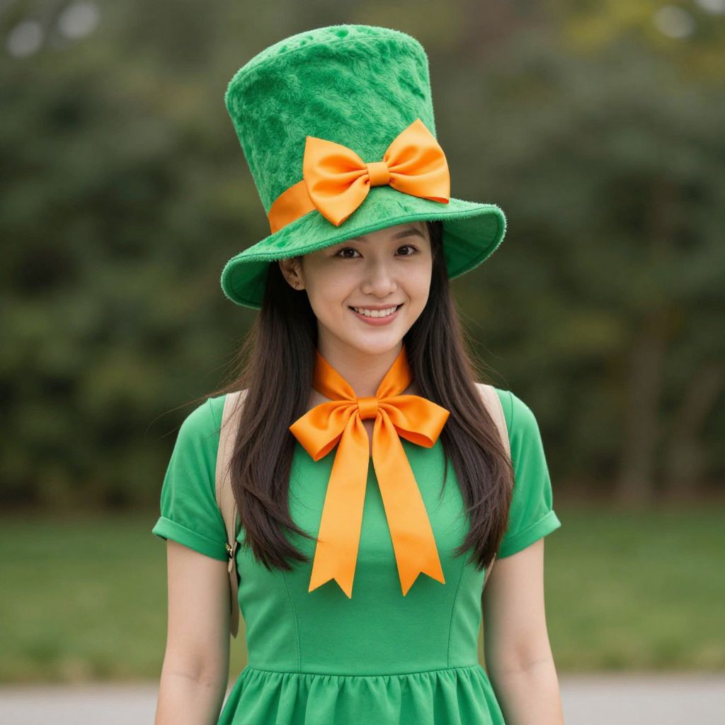 Patricks Day Girl Costume, woman wearing green dress and hat with orange ribbon and bow