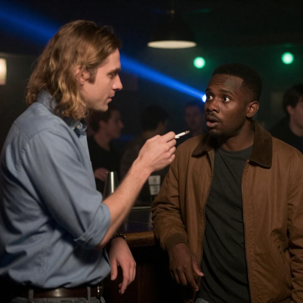 Photograph of a dimly lit bar. A man with long blonde hair and a blue shirt points a cigarette at a dark-skinned man with short hair and a brown jacket. The dark-skinned man looks surprised. Background includes green lights, blurry patrons, and bar equipment. Blue beams of light cross the scene.