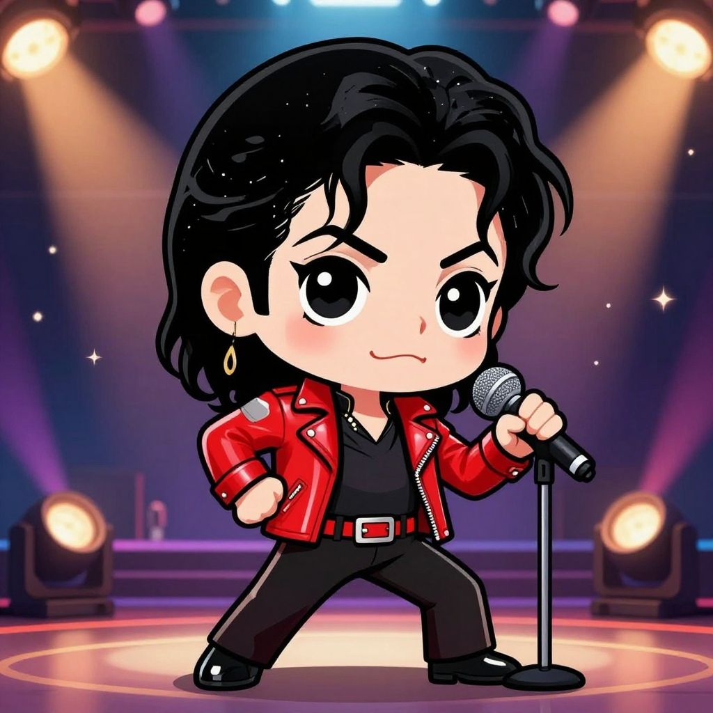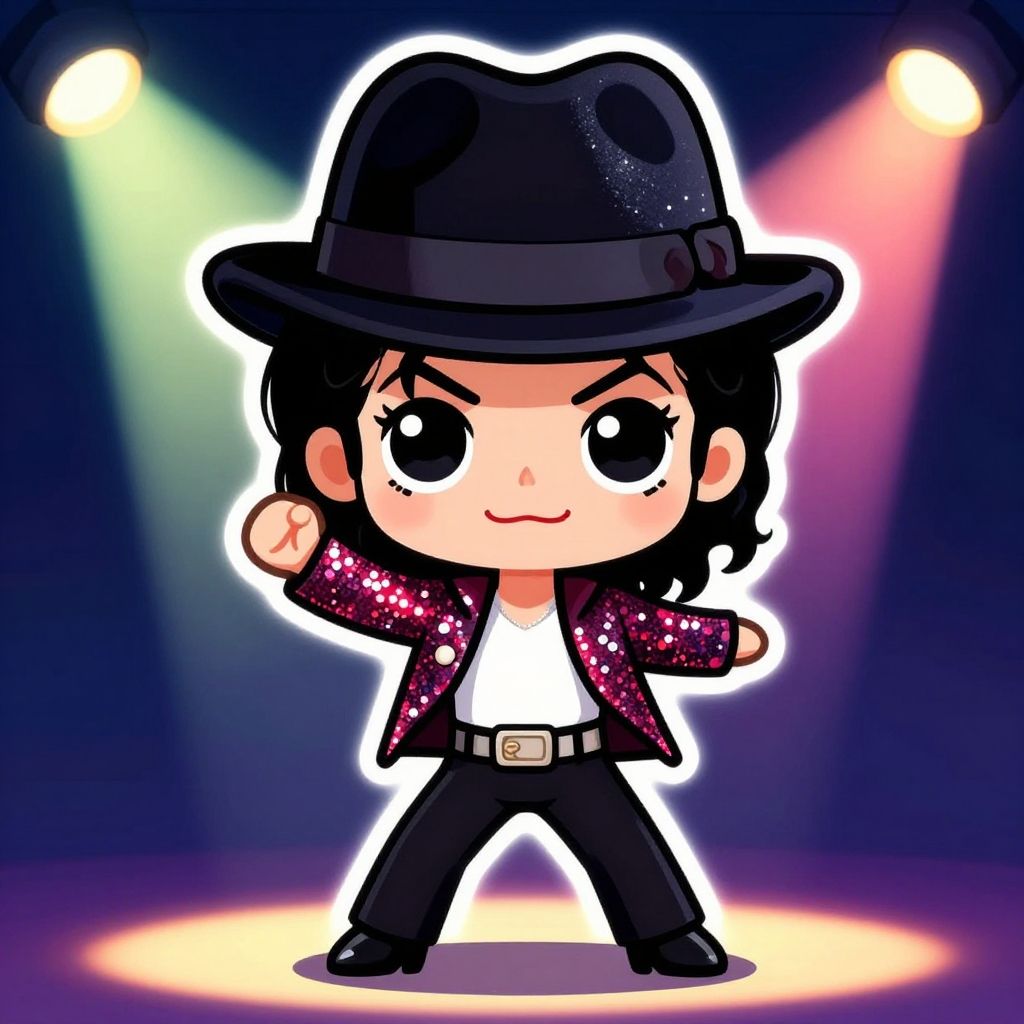 Cute michael jackson chibi with oversized head and small body, classic black and white outfit, performing iconic toe stand on stage, lively colors, smooth shading and whimsical atmosphere