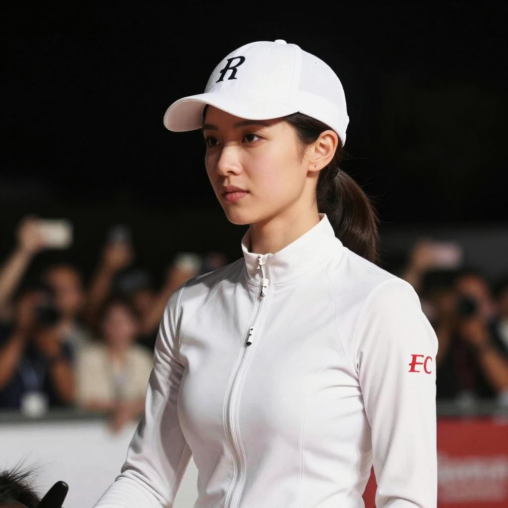Photo of a woman, (wearing equitation_outfit, wearing cap:1.3), white equitation_outfit, good hand, 4k, high-res, masterpiece, best quality, head:1.3, ((Hasselblad photography)), finely detailed skin, sharp focus, (cinematic lighting), night, soft lighting, dynamic angle, [:(detailed face:1.2):0.2], medium breasts, (((in front of a crowd))), outside