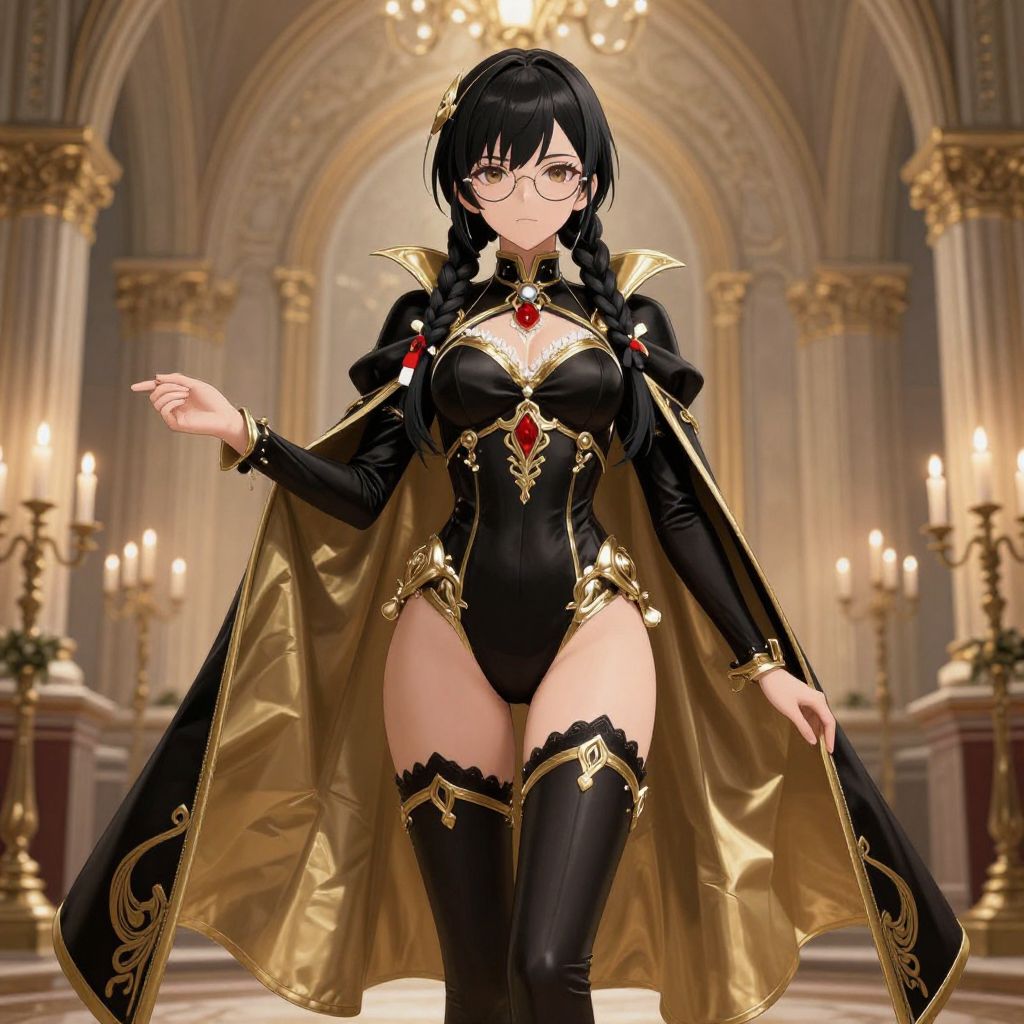 Illustration of a young anime woman with black braided hair and glasses wearing a form-fitting black and gold gothic bodysuit and an ornate cape. She is posed in a grand, candlelit architectural setting with arches and candelabras, holding her cape open.