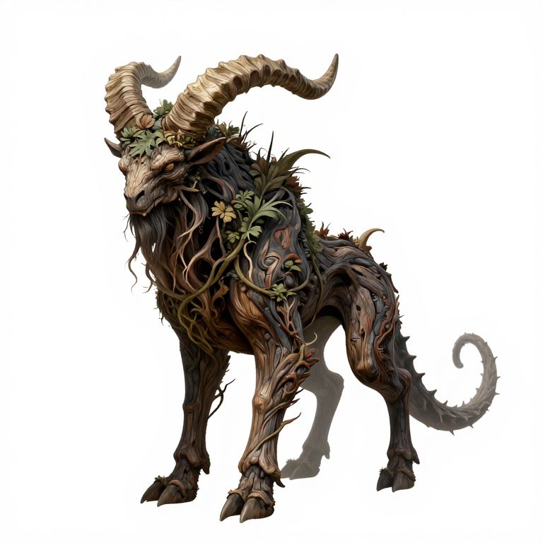 The image depicts a mystical, fantastical creature standing against a stark white background. This creature has a humanoid form with a large, curved horn on its head, adorned with green and brown foliage. Its body is covered in a mix of dark, weathered wood and organic textures, giving it an ancient, almost skeletal appearance. The creature's legs are thick and muscular, with roots and vines entwined around them, adding to its mystical aura. Its tail is long and twisted, with sharp, thorny protrusions. The overall composition is balanced, with the creature centrally positioned, and its intricate details and textures creating a sense of depth and complexity.
