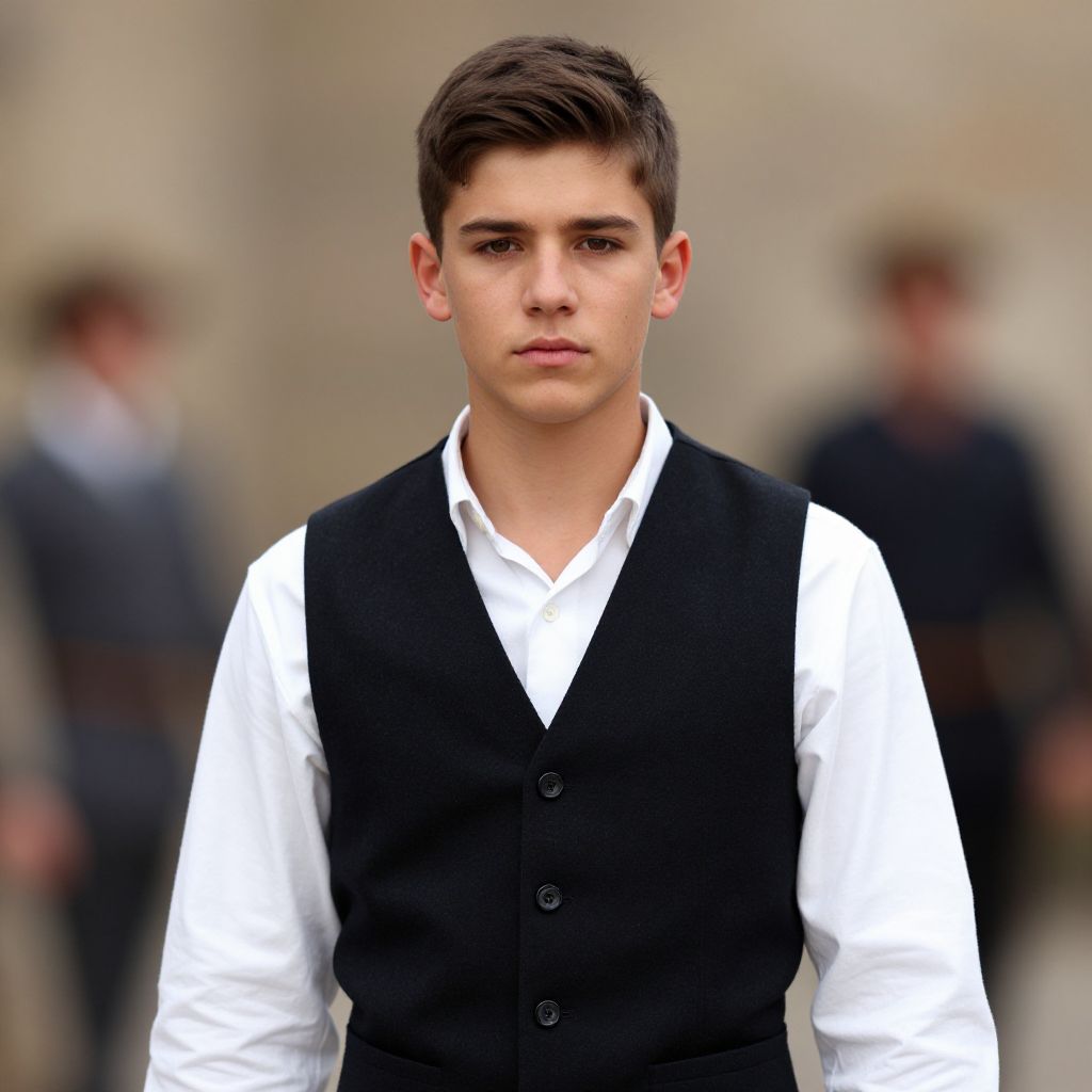 Period costume man, 1boy, male focus, solo, blurry background, blurry, realistic, shirt, looking at viewer, white shirt, vest, old, upper body, long sleeves