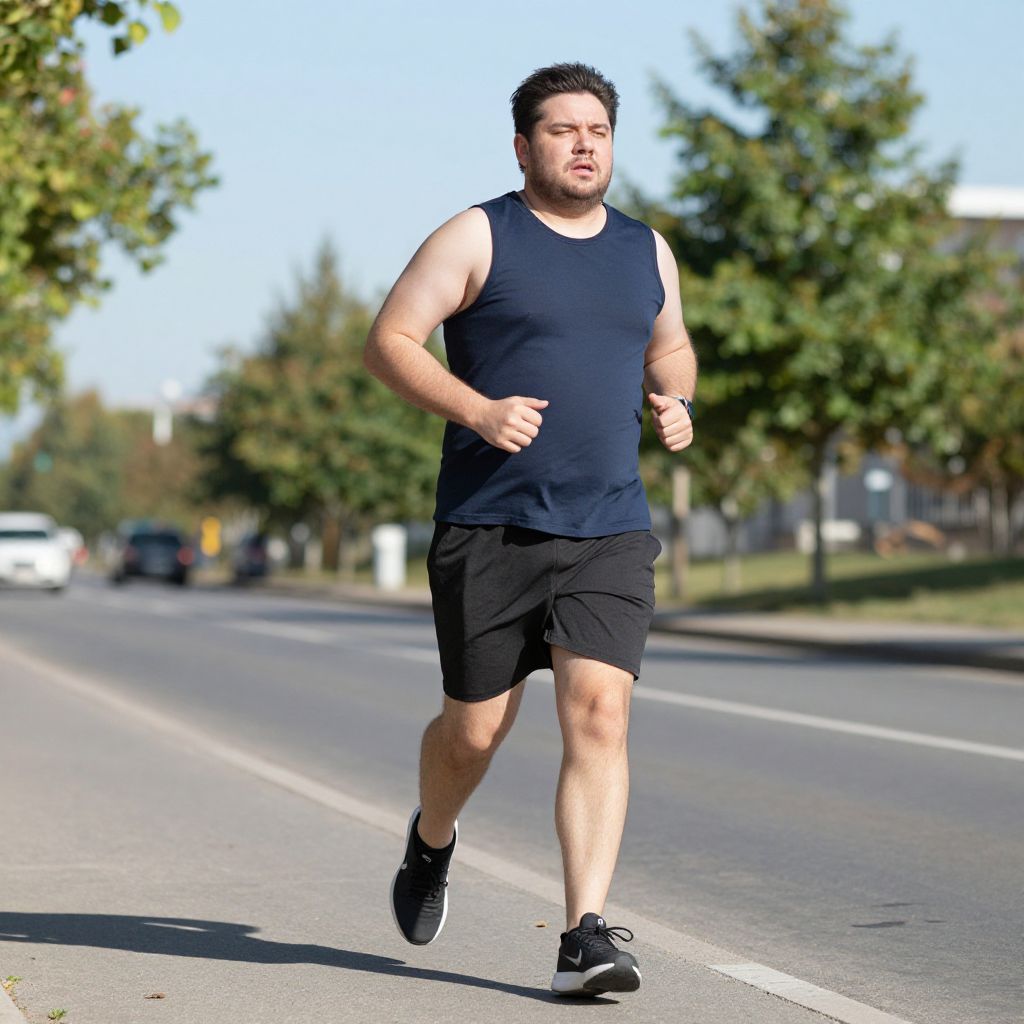 Photograph of a middle-aged, heavyset man with short black hair, wearing a navy tank top, black shorts, and black sneakers, jogging on