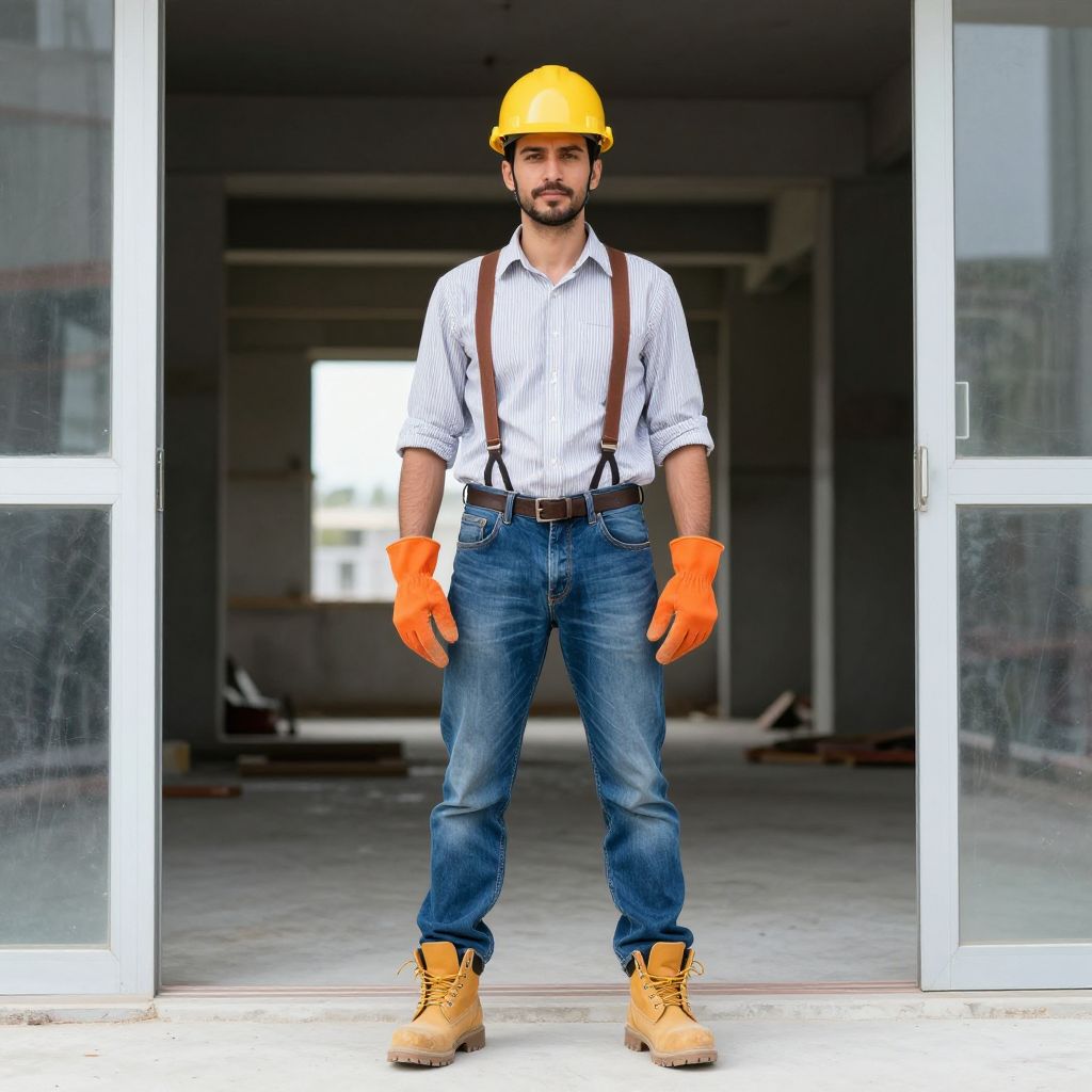Full body portrait of a male construction worker standing confidently at a construction site entrance. He is wearing a yellow hard hat, orange gloves, a striped shirt with rolled-up sleeves, blue denim pants held by brown suspenders, a brown belt, and yellow work boots. The background shows an unfinished building interior.