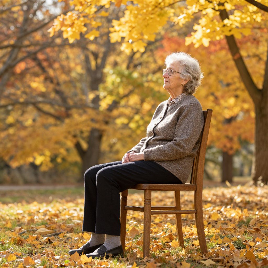 Elderly woman sitting peacefully on a wooden chair amidst vibrant autumn foliage, surrounded by golden leaves and bathed in warm sunlight filtering through colorful trees in the background.