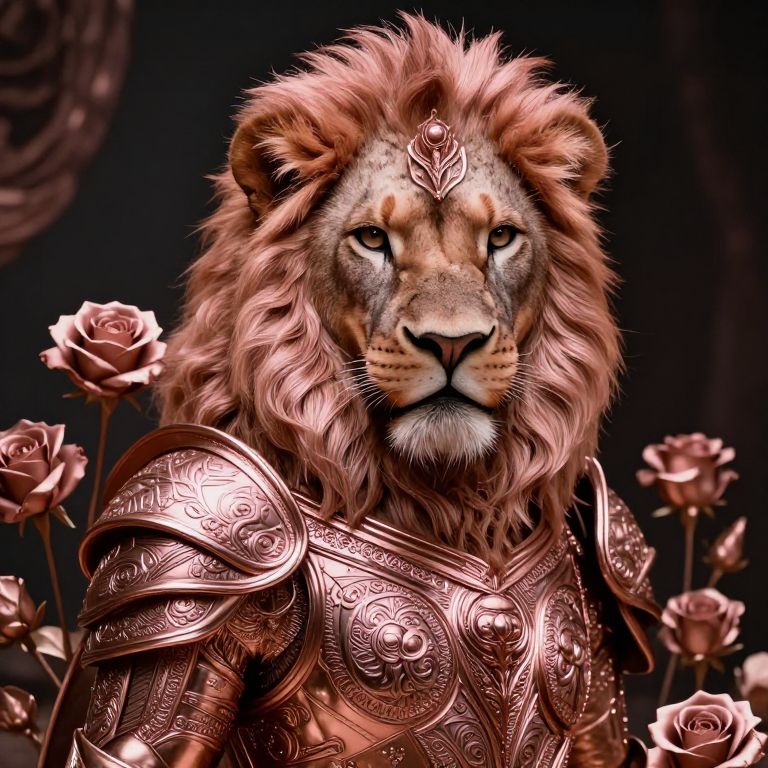 The image presents a stunning interpretation of an armored lioness, exuding an aura of luxury and elite status. The lioness is adorned with intricate, hypermaximalist armor, crafted from rose gold, which is both symmetrical and ornate, reminiscent of the work of Ernst Haeckel, Charles Audubon, and Alphonse Mucha. The armor is detailed with elaborate patterns and textures, creating a sense of depth and richness. Surrounding the lioness are delicate rose gold roses, adding to the opulent feel of the scene. The background is dark, with a subtle interplay of light and shadow, highlighting the intricate details of the armor and the lioness's fierce yet regal expression. The overall composition is cinematic, with the lioness positioned centrally, drawing the viewer's attention to her powerful presence and the intricate details of her armor. The image is a testament to the artist's skill in creating a harmonious blend of natural and fantastical elements, resulting in a hauntingly beautiful and highly detailed visual experience.