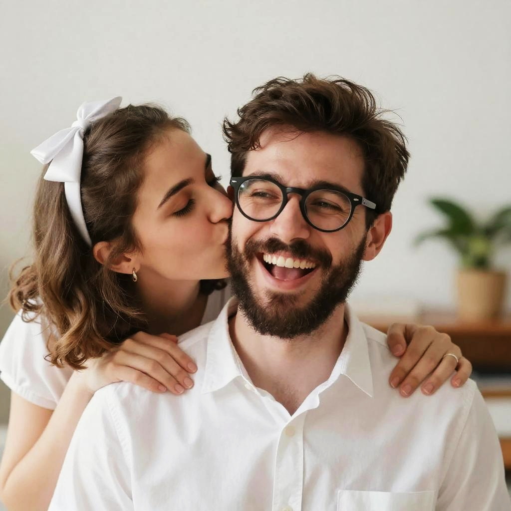 A warm, candid photograph of a smiling couple hugging on a gray couch. The man, with short dark hair and a beard, wears a light blue shirt. The woman, with long brown hair, wears a white T-shirt and a black wristband. They're in a bright kitchen with blurred appliances in the background. The image exudes happiness and affection.