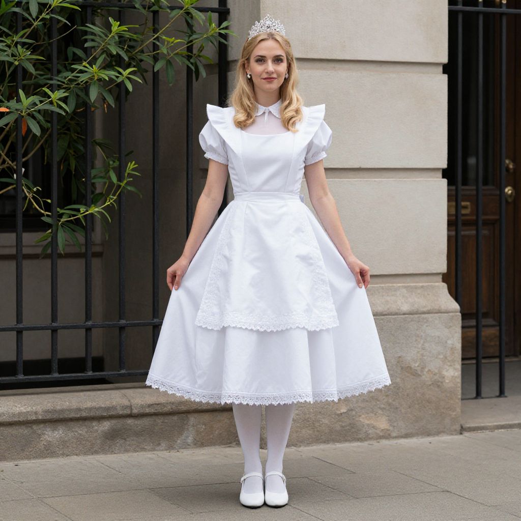 Photograph of a blonde girl in a white, puffed-sleeve, tiered dress with lace trim, white tights, and white shoes