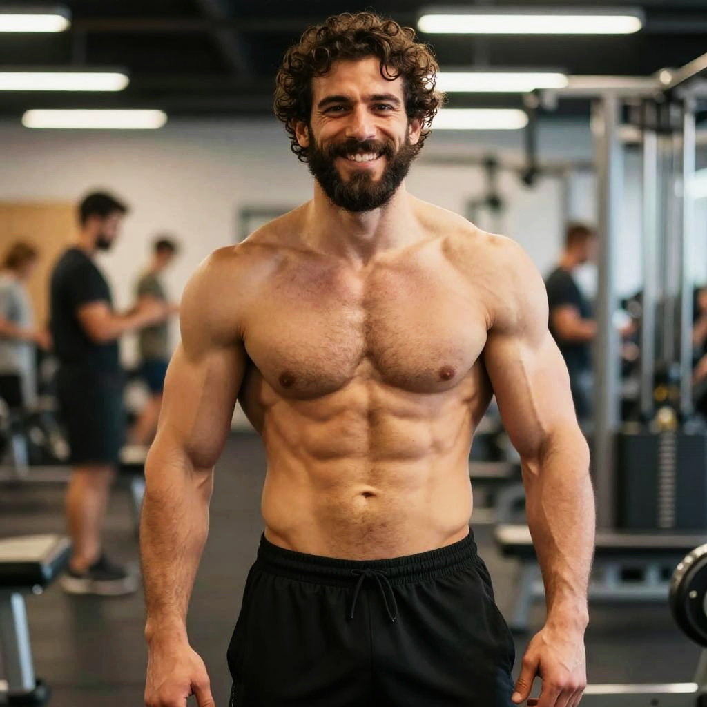 Photograph of a muscular, bearded man with curly blonde hair wearing a red long-sleeve shirt, black pants, and blue sneakers, standing