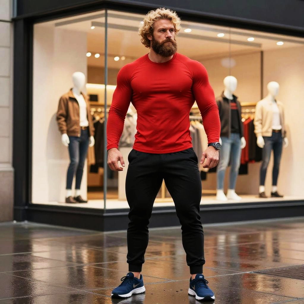Photograph of a muscular man with a thick beard and curly blond hair, wearing a tight red long-sleeve shirt, black pants, and blue sneakers. He's standing on a wet city sidewalk, with a brightly lit clothing store in the background displaying mannequins in various outfits. The store has large glass windows and is lit with white lights. The man looks confident and strong.