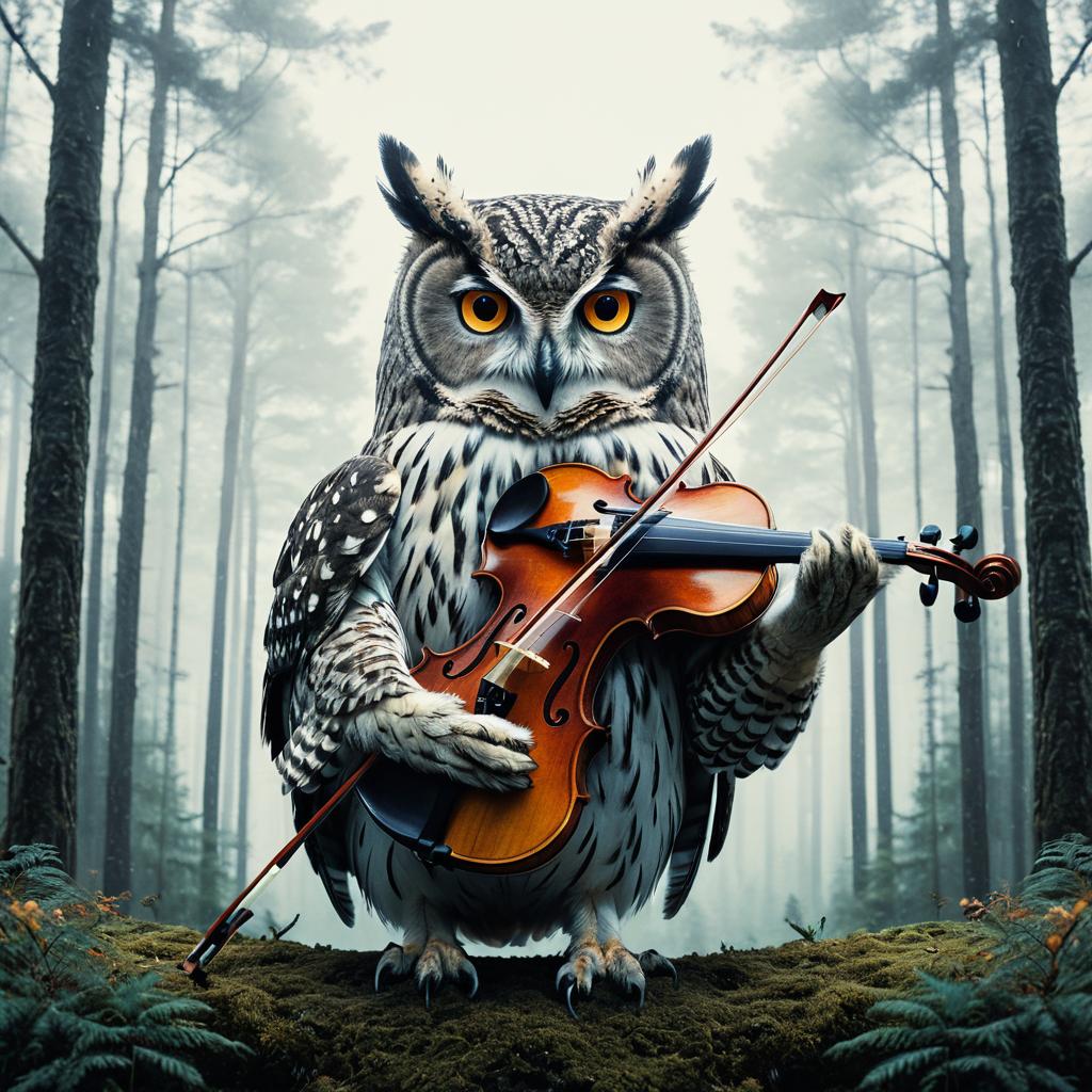 Panoramic widescreen view of a mysterious figure playing a flute with a twilight sky and a deep focus, surreal and whimsical style inspired by Jacek Yerka, high detail