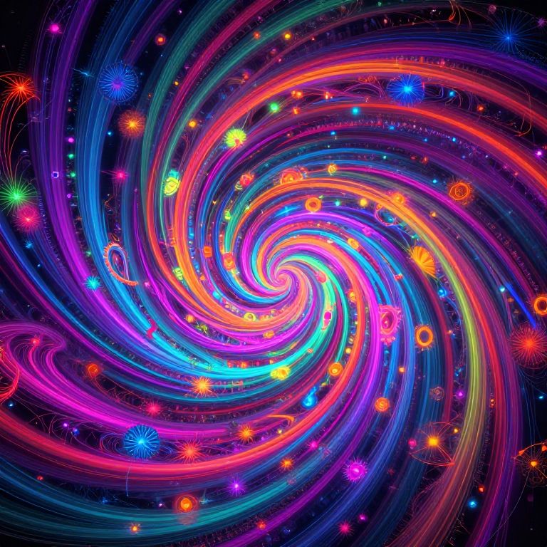 This is a vibrant, digital CGI image of a swirling galaxy. The central spiral is composed of colorful, neon-like lines in shades of purple, blue, pink, and orange, forming a dynamic, hypnotic pattern. Surrounding the spiral are numerous bright, glowing stars and cosmic particles in red, green, blue, and yellow, scattered throughout the dark, starry background. The lines and stars create a sense of depth and motion, resembling a cosmic whirlpool. The image has a futuristic and psychedelic aesthetic, with a high contrast between the bright colors and the dark space, enhancing the visual impact.