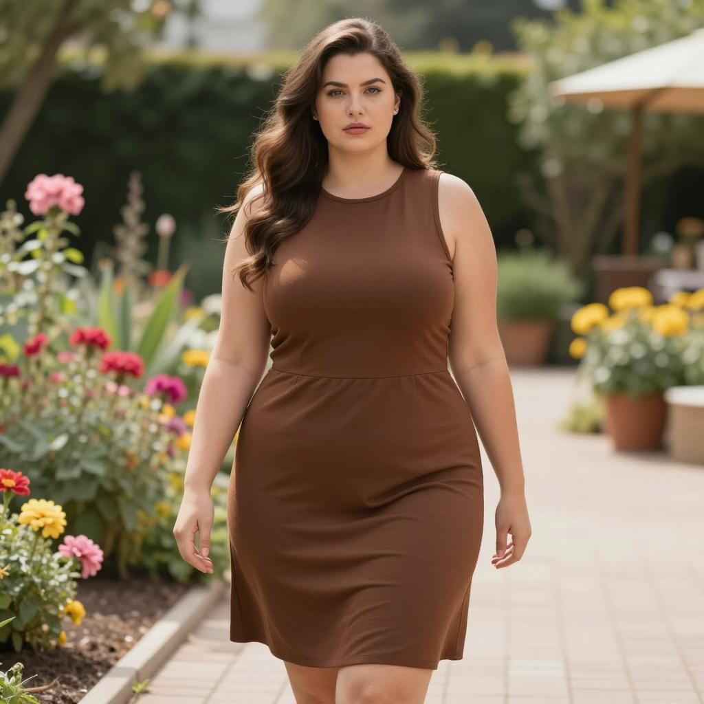 Brown plus size party dress, photorealistic, female model, long brown hair, sleeveless brown dress, standing in garden path, colorful flowers, pink, red, yellow, green foliage, daytime, sunlight, serious expression, medium breast size, olive skin, natural light, blurry background, summer, casual fashion, centered in image