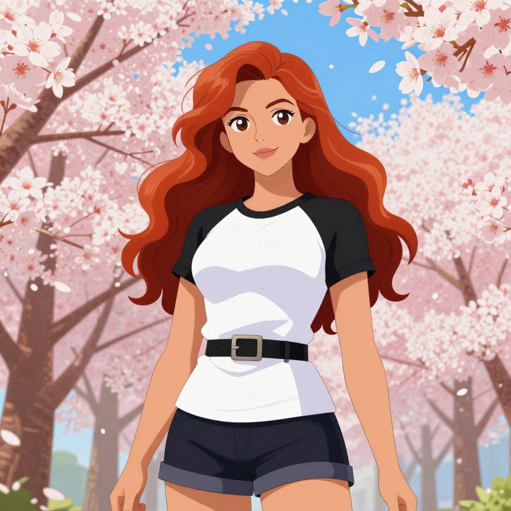 Digital anime-style illustration of a red-haired woman with long wavy hair, wearing a white and black raglan shirt and black shorts, standing under cherry