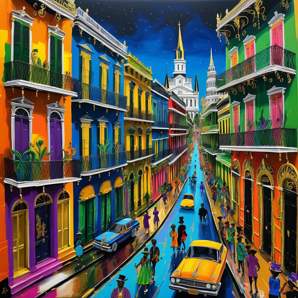 Fine detail painting of a vibrant New Orleans street during Mardi Gras, featuring colorful colonial-style buildings, people dressed in festive clothing, vintage cars, and festive decorations. The scene includes iconic church spires in the background under a starry night sky, capturing the celebratory atmosphere in a style reminiscent of Basquiat with intricate and ornate elements.
