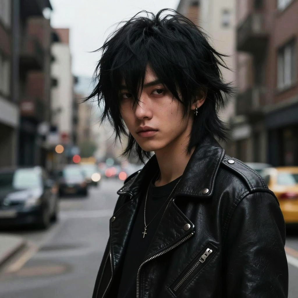 Portrait of a confident person with black wolf cut hair, wild and textured, urban street style with leather jacket, grungy cityscape, dramatic lighting