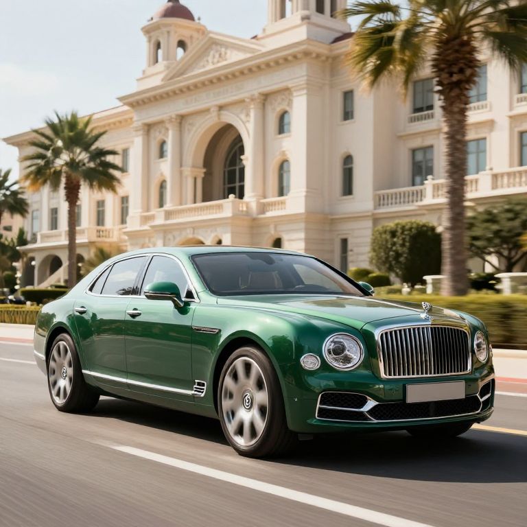 Luxurious Bentley Mulsanne Le Mans Limited Edition glides gracefully along a sunlit road, its sleek green exterior reflecting the grand architecture of a classical building and palm trees in the background.
