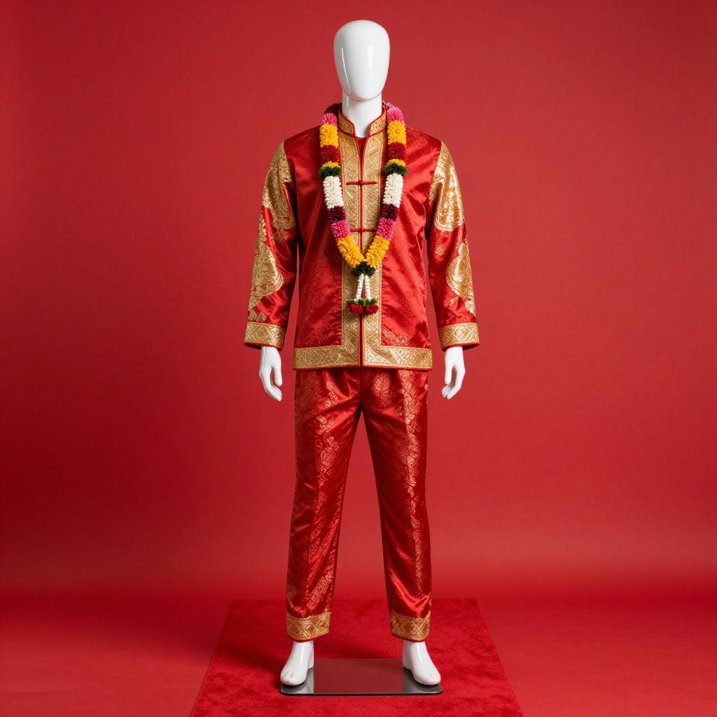 A mannequin wearing a traditional red and gold outfit with a garland around his neck, standing on a red carpet with a red background. The mannequin has a sleek, lifelike design with detailed textures, emphasizing the vibrant colors and elegant patterns of the clothing. The red carpet reflects the bright red background, creating a bold and striking visual contrast. The garland adds a touch of cultural symbolism and festive decoration, enhancing the overall aesthetic of the scene.