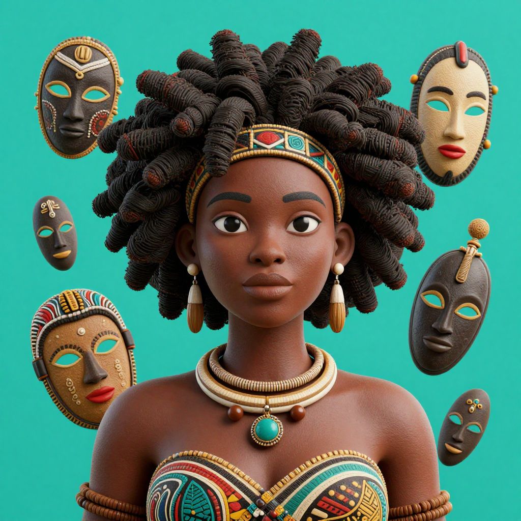 The image is a striking 3D render of an African woman, adorned with intricate cultural elements. Her hair is styled in voluminous, layered curls, reminiscent of traditional African hairstyles. She wears a headpiece with elaborate patterns and textures, blending seamlessly with the surrounding elements. The background is a solid, vibrant teal, providing a stark contrast to the warm, earthy tones of the woman's attire and accessories. Various cultural symbols, such as masks and traditional jewelry, are integrated into the composition, creating a dynamic and layered visual experience. The overall arrangement is balanced, with the woman's face and body centrally positioned, surrounded by the rich, colorful textures and patterns that evoke a sense of cultural heritage and artistic expression.
