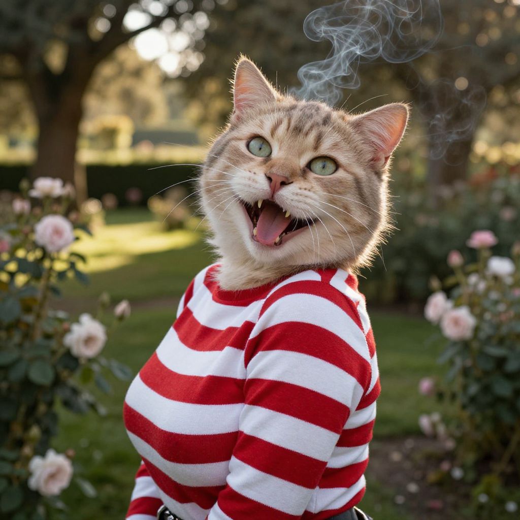 Photograph of a smiling tabby cat with green eyes, wearing a red and white striped shirt, standing in a sunlit garden with blooming roses