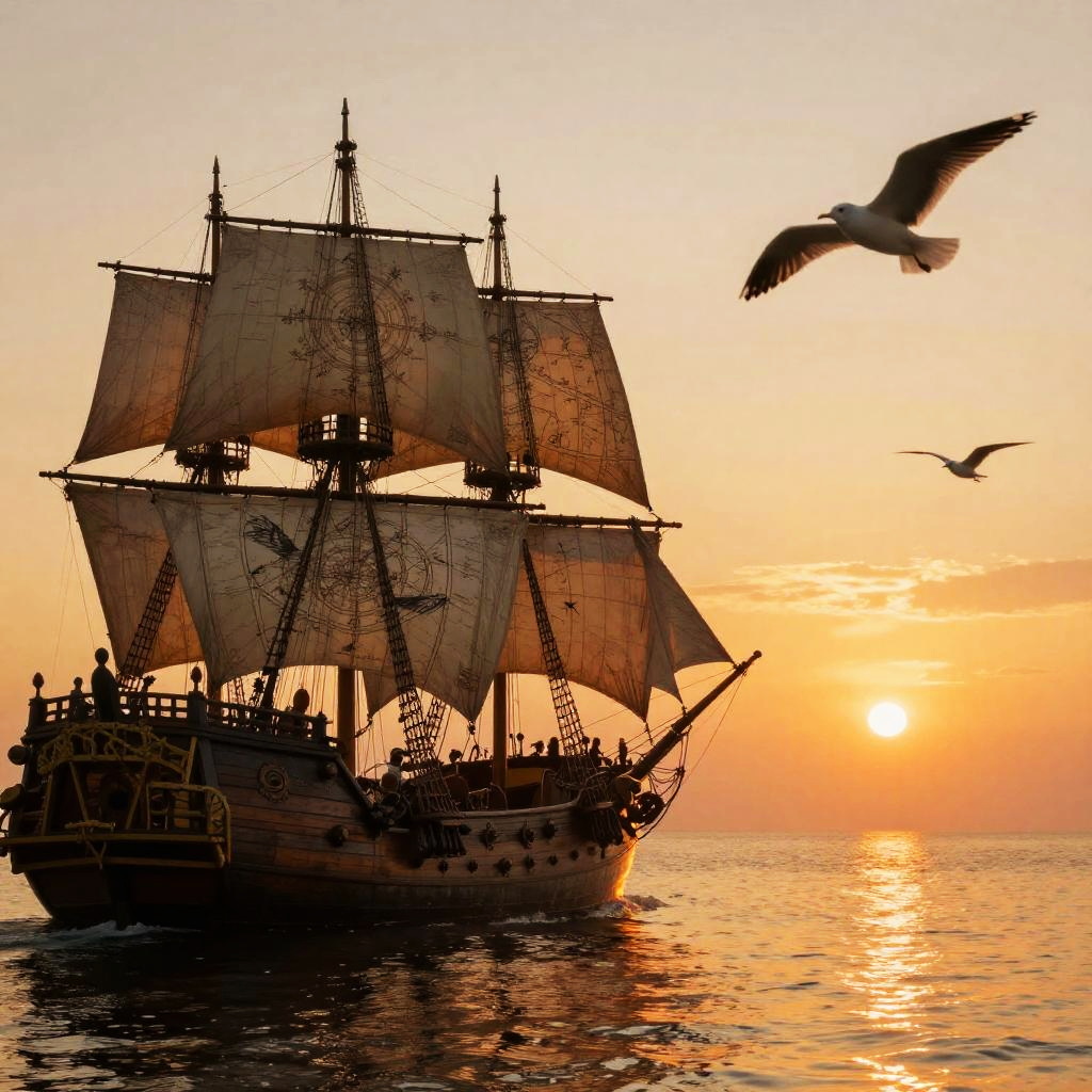 Side of pirate ship sailing into sunset, glowing orange sky, billowing sails, reflections on calm water, seagulls in flight, old nautical map style, romantic adventurous mood