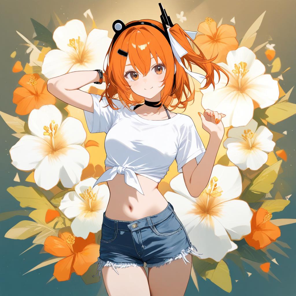 Digital illustration of an anime girl with short orange hair wearing a white tied crop top and denim shorts, standing in front of tropical green leaves and vibrant orange hibiscus flowers. The character has orange eyes and accessories in her hair, with a friendly smile and a modern casual summer outfit.