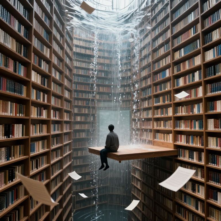 Solitary figure sits perched on a wooden platform amidst towering bookshelves, surrounded by cascading water that mirrors the shelves' reflections, while scattered papers float around, creating an ethereal library suspended between reality and dreams.