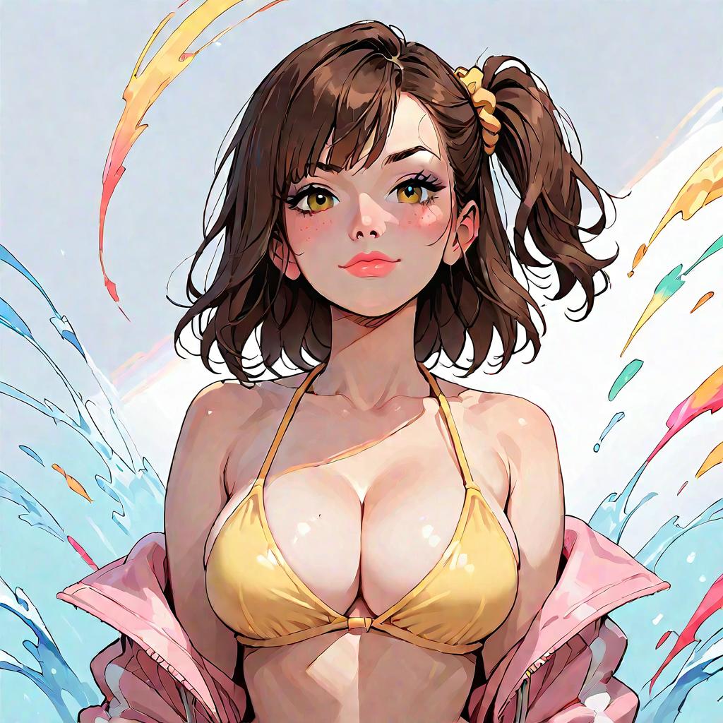 Source_anime, score_9, score_8_up, score_7_up, score_6_up, score_5_up, score_4_up, 1girl, solo, medium hair, looking at viewer, smile, large breasts, brown hair, navel, cleavage, brown eyes, jacket, swimsuit, upper body, bikini, open clothes, off shoulder, side ponytail, open jacket, yellow bikini, scrunchie, pink jacket