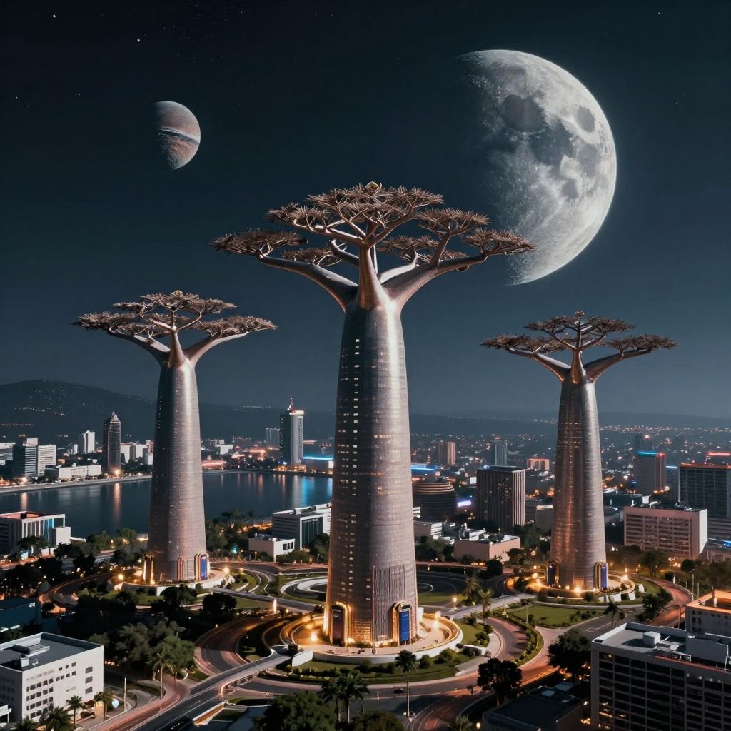 Aerial view of three artificial baobab-tree like skyscraper structure in a futuristic millennia city, on a harbor valley, A small planet excentered floating in space, a big one float aside moon-like covering more than half of the background, the architecture looks alike a baobab tree big trunk and multiple tiny spreading up branchs architecture, [baobab-like-skyscrapers], antigravity technology, cinematic lighting, nightly photography, cyberpunk, postmodern, futurism