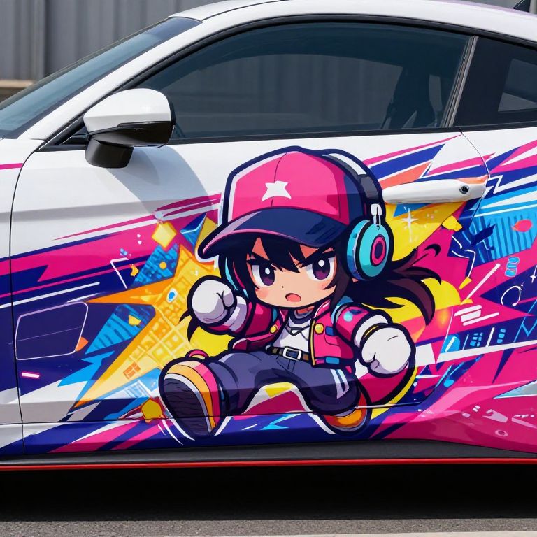 Anime car sticker featuring a vibrant, dynamic design with a chibi anime character in bold colors, surrounded by stylized speed lines and digital effects, perfect for car decals on racing vehicles and street art scenes.