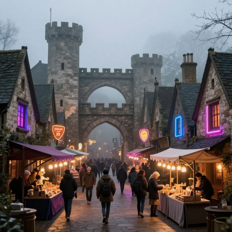 A misty medieval village seamlessly blends with a vibrant, neon-lit marketplace, where timeless stone archways meet futuristic stalls, creating a dreamlike realm where past and future coexist.