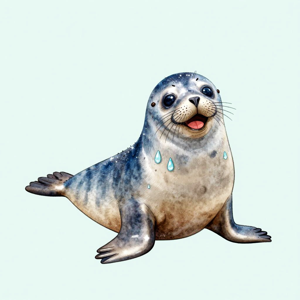 Watercolor hand-drawn illustration of a gleeful otter pup, with a velvety chocolate brown body, sparkling watery bubbles shell, wide joyful smile, set against a white background, simple and hopeful aesthetic.