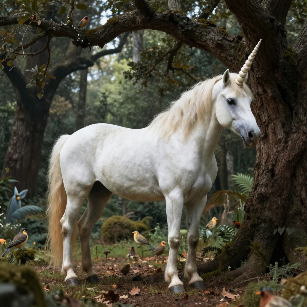 Realistic unicorn in forest, elegant unicorn with pearly coat and spiraled horn resting next to a giant oak tree, intricate forest detail with birds and small woodland creatures, cinematic lighting