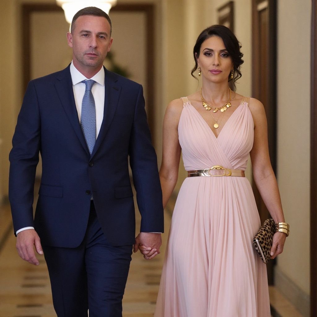 Photograph of a man and woman walking hand-in-hand down a grand hallway with warm lighting. The man, with short dark hair and a fair complexion, wears a navy blue suit, white dress shirt, and light blue tie. The woman, with wavy brown hair styled in an updo, has a fair complexion and wears a sleeveless, pale pink, pleated dress with a gold belt and multiple gold necklaces. She holds a leopard-print clutch in her right hand. The background features a long corridor with ornate, classical architecture and a chandelier. Both individuals exude elegance and sophistication.