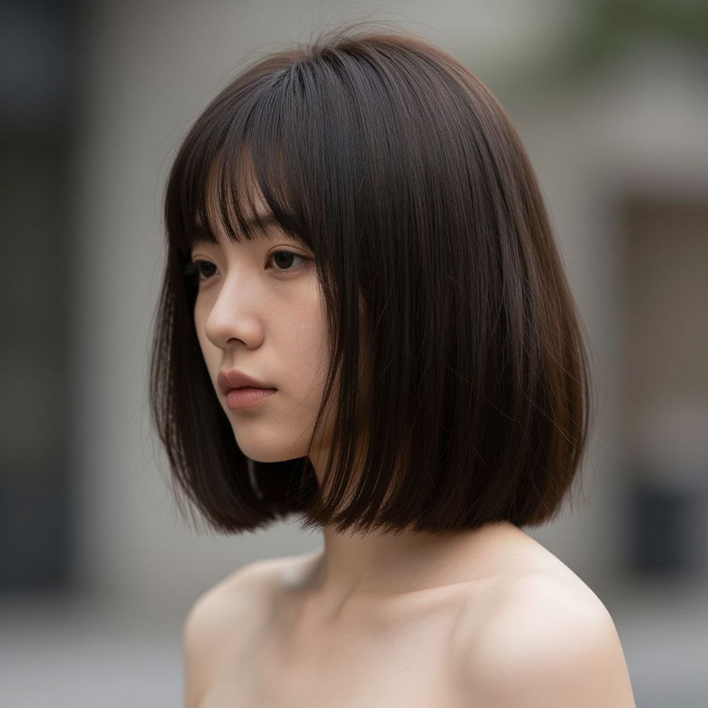Photograph of an East Asian woman with a short, straight black bob haircut with bangs. She has fair skin and is looking slightly to the side with a neutral expression. She is topless, revealing bare shoulders. The background is blurred, featuring muted gray and green tones, suggesting an outdoor urban setting. The lighting is soft, highlighting the smooth texture of her hair and the subtle contours of her face. The overall composition is focused on her head and upper shoulders, emphasizing her facial features and hairstyle.
