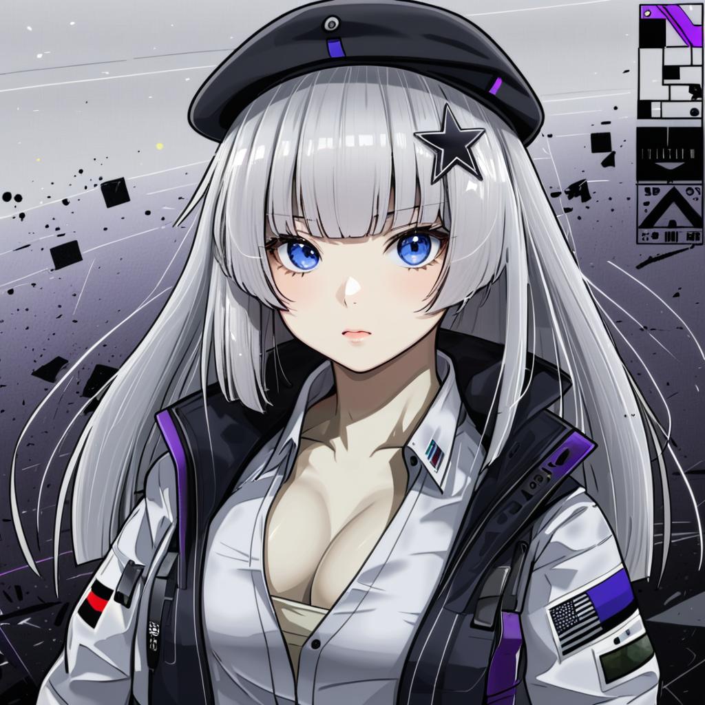 Aa-12 (girls' frontline), girls' frontline, 1girl, blue eyes, bags under eyes, long hair, grey hair, star hair ornament, ahoge, medium breasts, cleavage, black headwear, by artist neko majin, anime