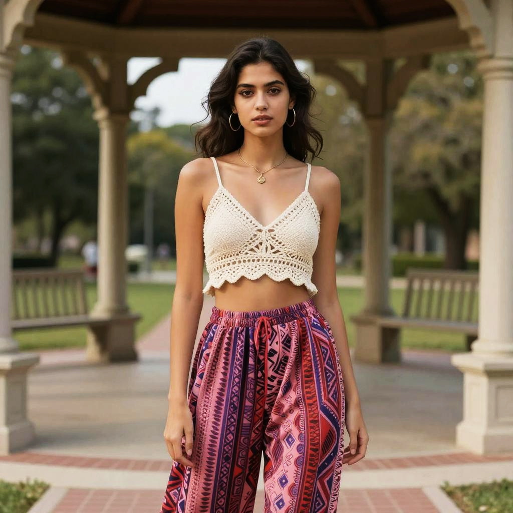 A lean woman in a boho chic cream crochet crop top and palazzo pants with tribal prints in pink, red, and purple hues, stands under a gazebo in a university campus, embodying a vertical inc visual style. Sexy. Pretty face and beutiful eyes