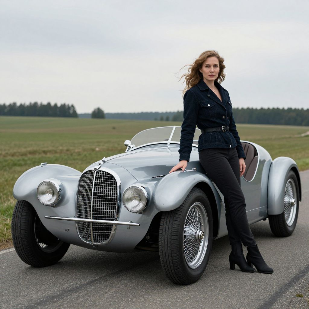 Photograph of a blonde woman in a red blouse and black skirt, leaning on a sleek, silver vintage convertible car.