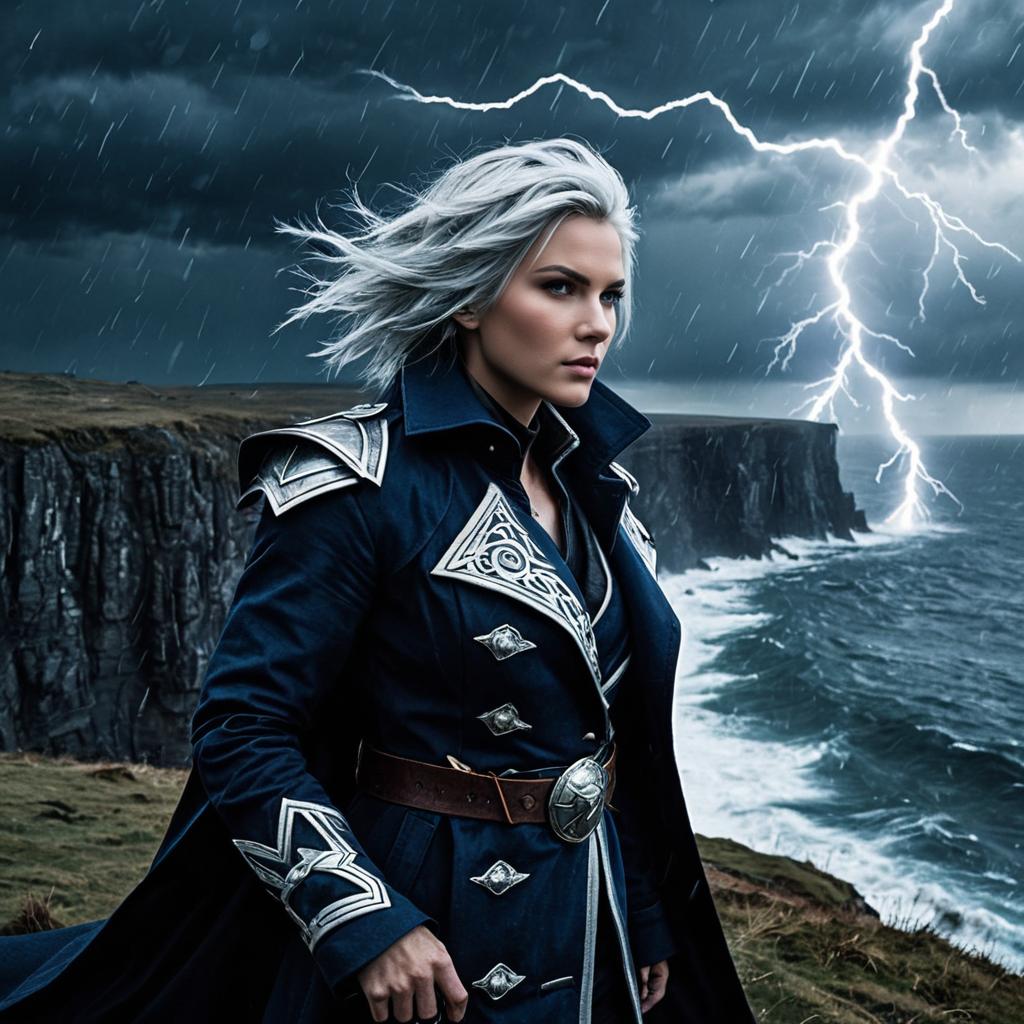 Cinematic photo of Riven, the Storm Herald, (high detail, 8k), standing in a thunderous cliffside overlooking a raging sea, striking stormy gray eyes, angular face with high cheekbones, wild, shoulder-length silver hair whipped by the wind. Stunning outfit: dark navy trench coat embroidered with silver lightning bolts. wearing a helm shaped like storm clouds, brandishing a crackling lightning spear. electrified blue ravens circling above. dramatic strobe lightning illuminating the scene, evoking a powerful and captivating atmosphere in a frost-covered realm.
