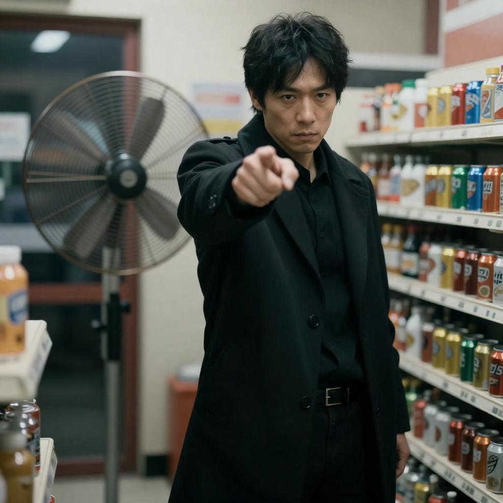 Photograph of an Asian man with short black hair, wearing a long black coat, pointing forward in a dimly lit convenience store. Behind him, a large industrial fan and shelves filled with soda cans are visible. The man's expression is serious, and the lighting creates a dramatic, high-contrast effect.