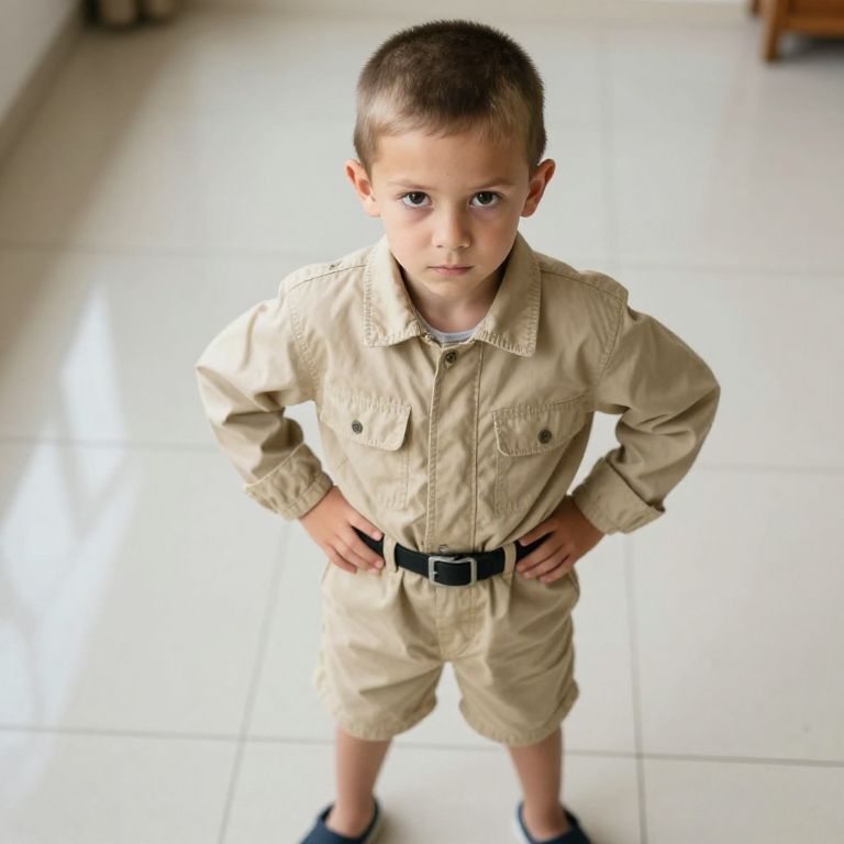 A young boy with short, neat hair and a serious, focused expression stands on a clean, tiled floor. He wears a beige jacket with a black belt and khaki shorts, the fabric slightly wrinkled from being worn. His hands are firmly on his hips, giving him a confident and composed posture. He is looking directly at the camera with steady, intense eyes, exuding a sense of quiet determination and thoughtfulness. The room is softly lit, highlighting the details of his outfit and the reflective tiles beneath his feet.
