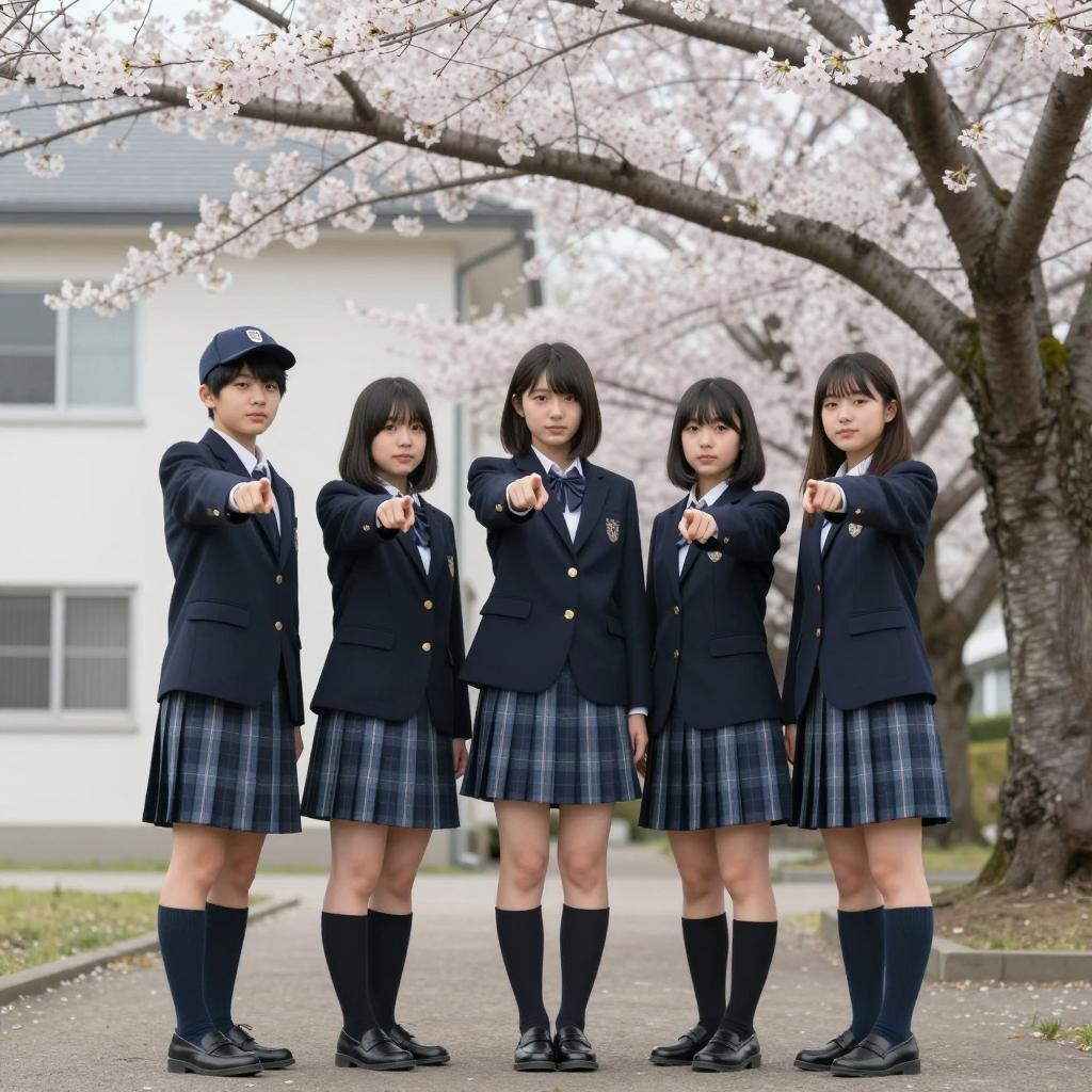 Five Japanese female students wearing knee-high socks, pleated skirts, and various coats stand against a pink star-patterned background. Three have long black hair and two have medium-length brown hair. One woman wearing a pink coat is smiling while the others have neutral expressions. The girls are dressed in school uniforms with white shirts, striped neck ribbons, black or gray jackets, and two wear black blazers while others wear gray or pink coats. They pose with varied hand placements and expressions.